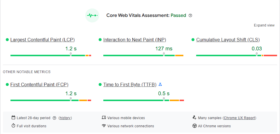 As you can see, the website “ServerMania.com” passes every metric with an excellent score. This is because we’ve used all the techniques shown in this guide to optimize our own website and provide instant page loading.